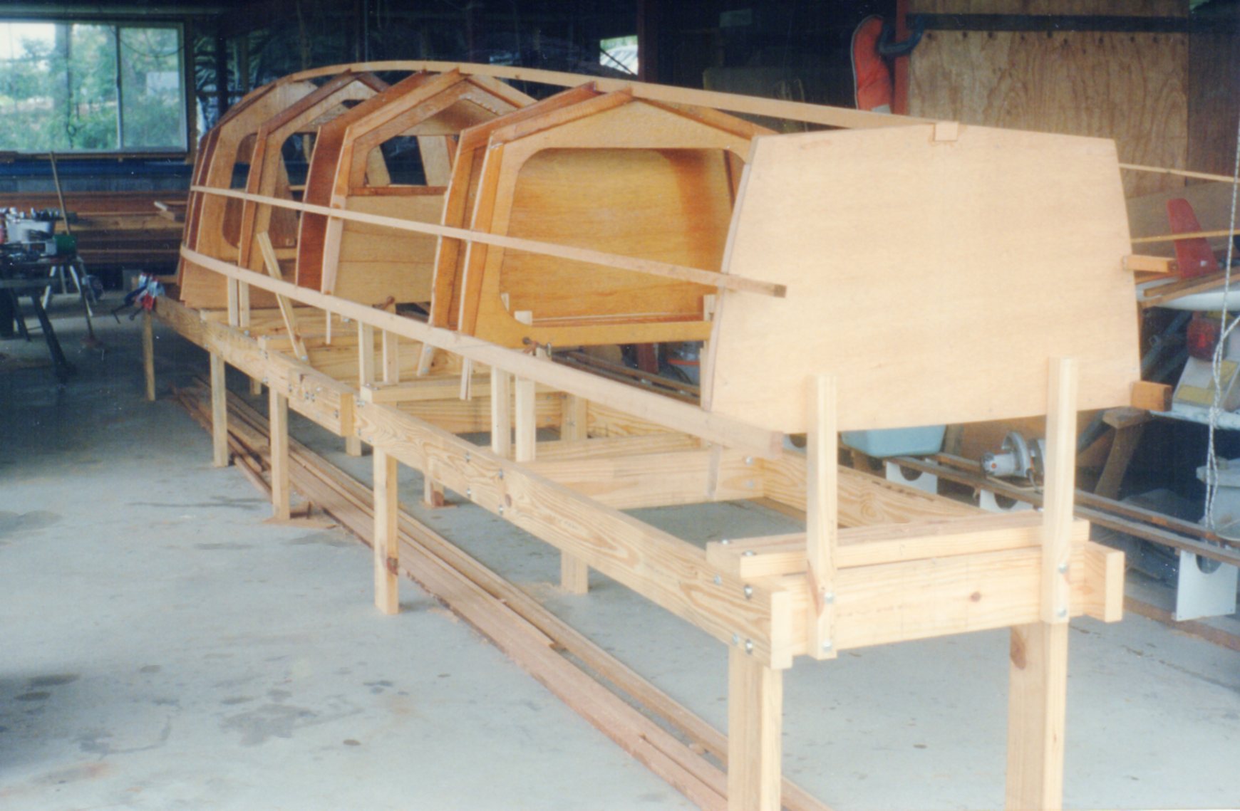 The two masts are "Woodwings" of my own design for improved performance. Two mainsails are used with a spinnaker as an option. The trailer allows the hulls to be moved outward for easy assembly by two adults.(or one fit adult). I have assembled, rigged and launched in 90 minutes. Same when retrieving. I tow with a Hyundai Excel 1500cc sedan.