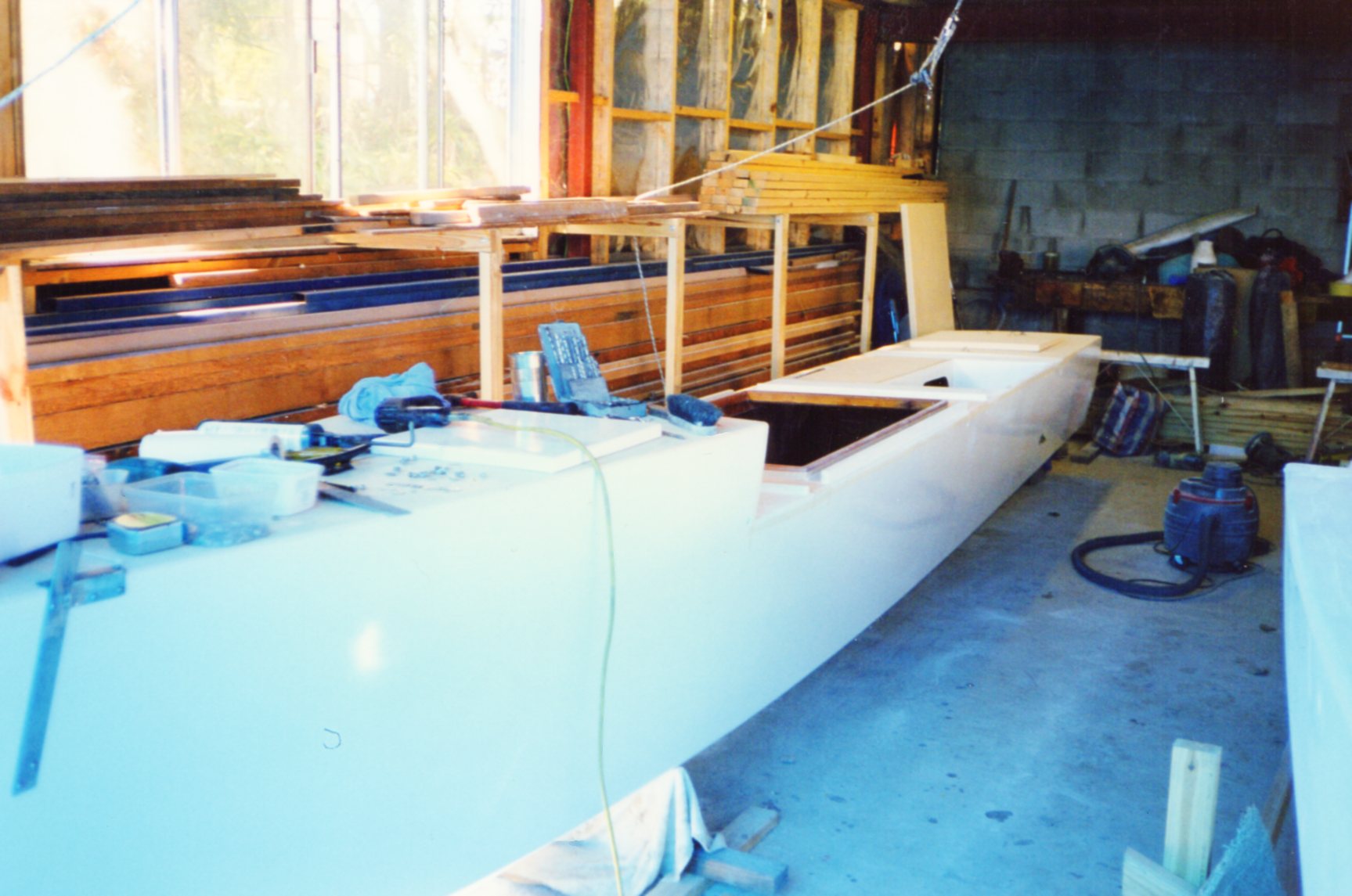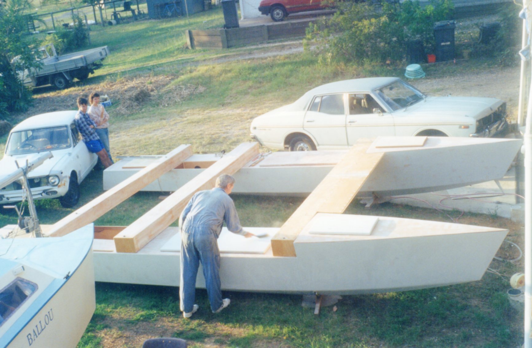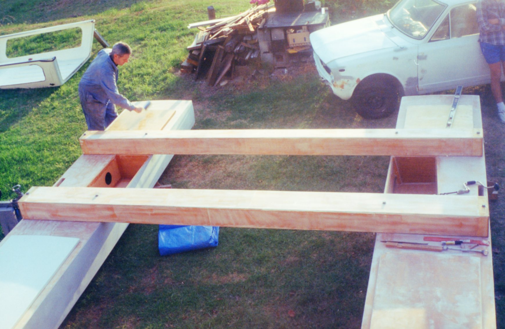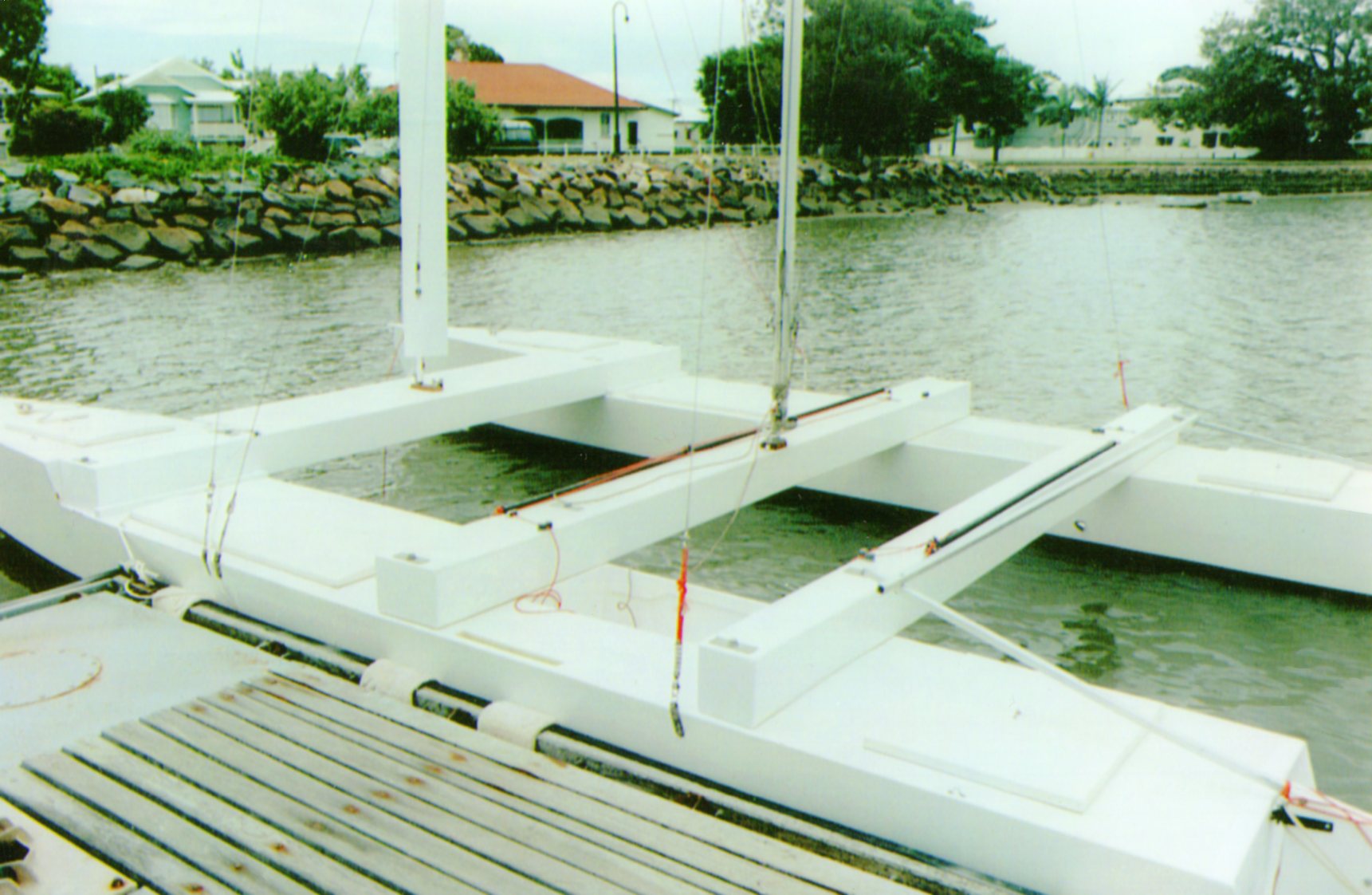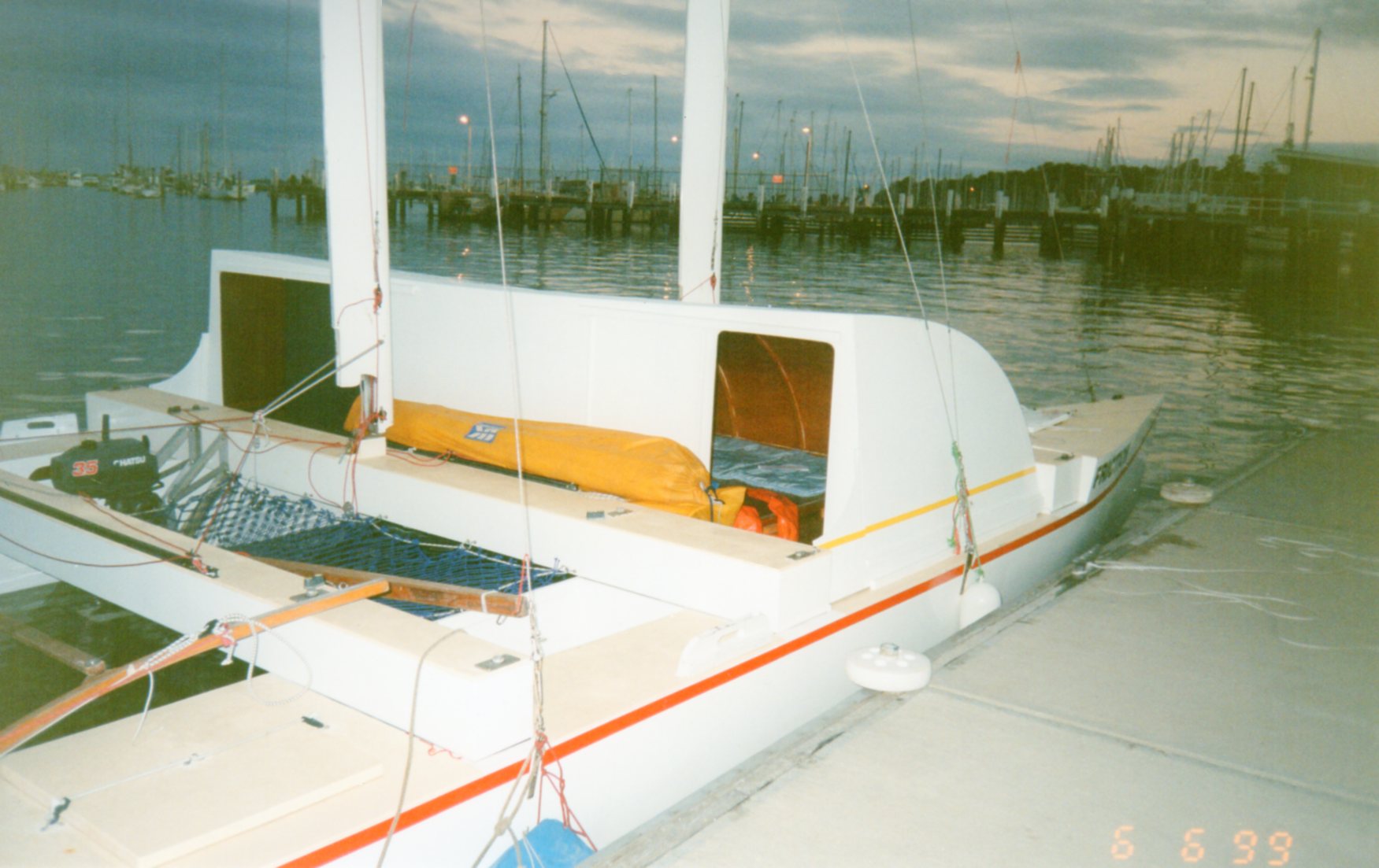 Aft of the cockpits the hulls are accessed via large hatches. A good place to store the gear that clutters a cabin. A large anchor well is built into one bow.Both bow sections incorporate crash bulkheads. (rules). All three beams are timber/ply with flat tops to walk on. Spaces between are filled with netting. The fwd beam is sloped under to deflect waves, the extra width forming a good walkway or deck. A 4.1 metre wide cabin with a double berth, stove and sink may be fitted and removed at will. (the cabin is held in place by the beams). When trailering the cabin fits lengthways on the hulls.