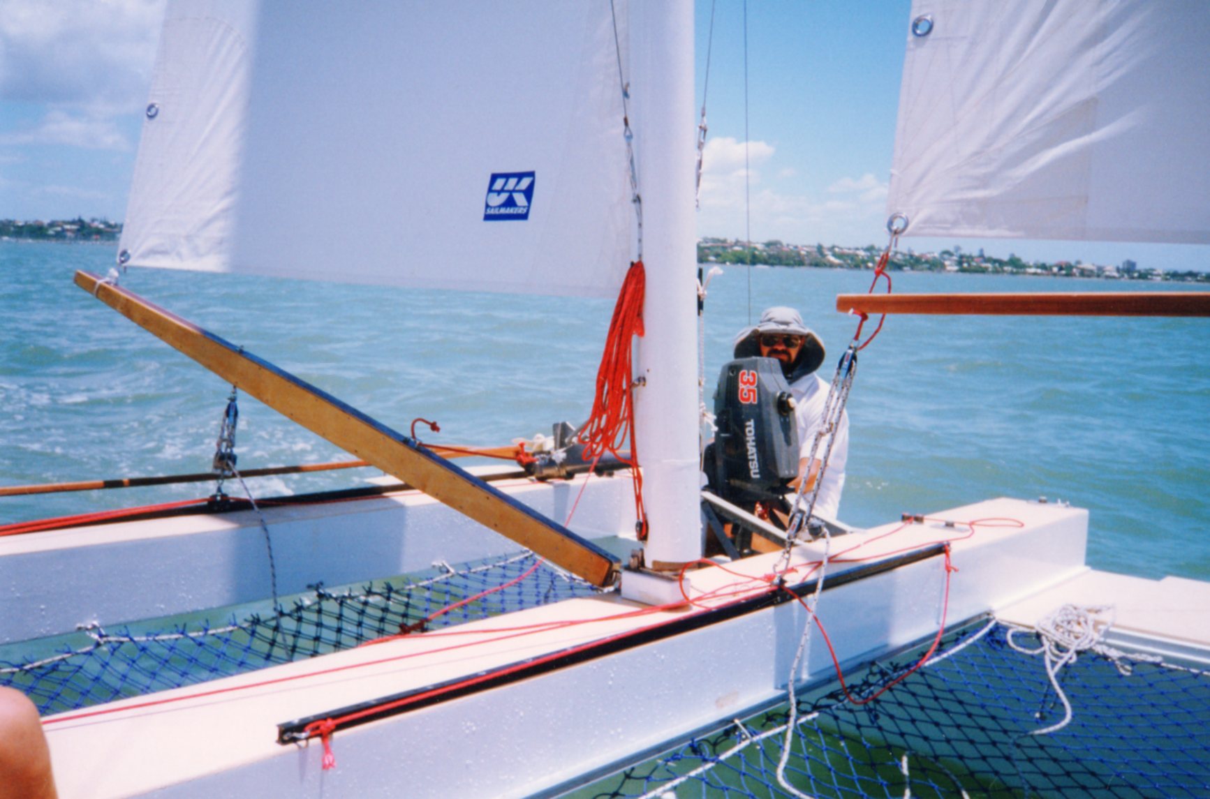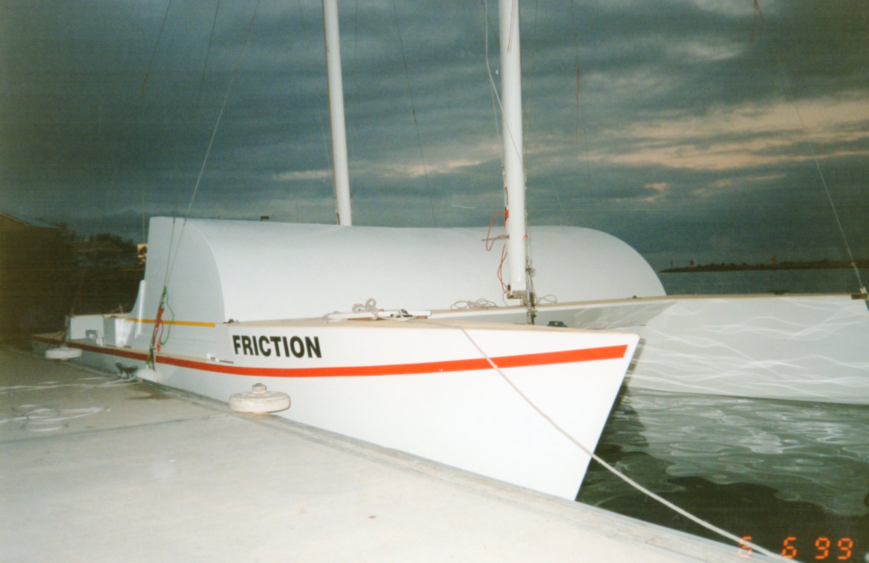 "FRICTION" Cost $6000 Australian to build (1997). Western Red Cedar timber, plywood skins, Epoxy resin fibre-glass, epoxy undercoat,polyurethane gloss, Dacron sails, woodwing masts, nets and all hardware.